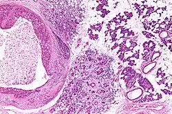 | Low magnification micrograph of a salivary duct carcinoma with characteristic comedonecrosis (left of image) adjacent to normal parotid gland (right of image). H&E stain. | |