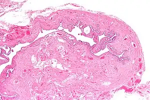 | Micrograph of salpingitis isthmica nodosa, showing the characteristic nodular thickening. H&E stain. | |