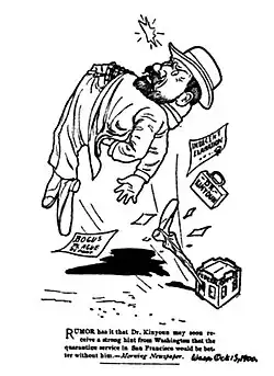 Allied with powerful railroad and city business interests, California governor Henry Gage publicly denied the existence of any pestilent outbreak in San Francisco, fearing that any word of the bubonic plague's presence would deeply damage the city's and state's economy.[46] Supportive newspapers, such as the Call, the Chronicle and the Bulletin, echoed Gage's denials, beginning what was to become an intense defamation campaign against quarantine officer Kinyoun.[47] In response to the state's denial, Wyman recommended to federal Treasury Secretary Lyman J. Gage that he intervene. Secretary Gage agreed, creating a three-man commission of investigators who were respected medical scholars, experienced with identifying and treating the plague in China or India. The commission examined six San Francisco cases and conclusively determined that bubonic plague was present.[11][48]
