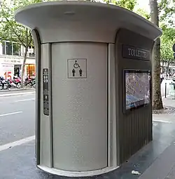 Sanisette (French pronunciation: [saniˈzɛt]) is a registered trademark for a self-contained, self-cleaning, unisex, public toilet pioneered by the French company JCDecaux. These toilets (and other similar toilets) are a common sight in several major cities of the world, but they are perhaps most closely associated with the city of Paris, where they are ubiquitous. In the United Kingdom, they (along with automated public conveniences of other brands) are known informally as "Superloos".[1][2]