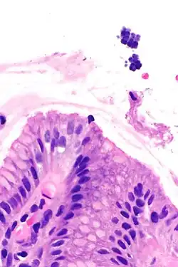 | Gastric mucosa and Sarcina on upper right. H&E stain. | |