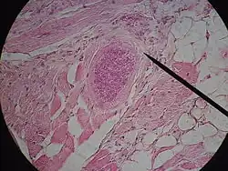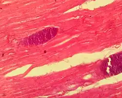 | Sarcocystis cyst in a sheep oesophagus. The cyst is approximately 4 mm across. | |