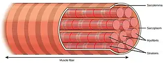 Sarcoplasm is the cytoplasm of a muscle cell. It is comparable to the cytoplasm of other cells, but it contains unusually large amounts of glycogen (a polymer of glucose), myoglobin, a red-colored protein necessary for binding oxygen molecules that diffuse into muscle fibers, and mitochondria.[1][2][3] The calcium ion concentration in sarcoplasm is also a special element of the muscle fiber; it is the means by which muscle contractions take place and are regulated.[4][5] The sarcoplasm plays a critical role in muscle contraction as an increase in Ca2+