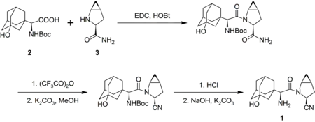 The synthesis of saxagliptin by Bristol-Myers Squibb by the amide coupling of N-Boc-3-hydroxyadamantylglycine (2) and methanoprolineamide (3) with EDC. The former is commercially available, whereas the latter is available as the N-Boc analog. The prolineamide moiety is subsequently dehydrated with trifluoroacetic anhydride to give the cyanide as the trifluoracetate ester, which is hydrolyzed. Removal of the Boc protecting group, followed by neutralization gives the desired product (1):[27]