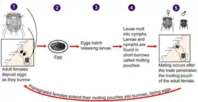 - ↑ Arlian, LG (1989). "Biology, host relations, and epidemiology of Sarcoptes scabiei". Annual Review of Entomology. 34 (1): 139–61. doi:10.1146/annurev.en.34.010189.001035. PMID 2494934.