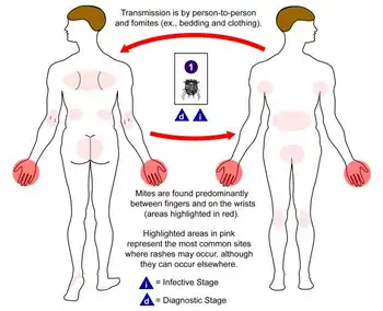 - ↑ 2.00 2.01 2.02 2.03 2.04 2.05 2.06 2.07 2.08 2.09 2.10 "Parasites – Scabies Disease". Center for Disease Control and Prevention. November 2, 2010. Archived from the original on 2 May 2015. Retrieved 18 May 2015.