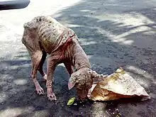 The most frequently diagnosed form of scabies in domestic animals is sarcoptic mange, caused by the subspecies Sarcoptes scabiei canis, most commonly in dogs and cats. Sarcoptic mange is transmissible to humans who come into prolonged contact with infested animals,[55] and is distinguished from human scabies by its distribution on skin surfaces covered by clothing. Scabies-infected domestic fowl suffer what is known as "scaly leg". Domestic animals that have gone feral and have no veterinary care are frequently afflicted with scabies and a host of other ailments.[56] Nondomestic animals have also been observed to suffer from scabies. Gorillas, for instance, are known to be susceptible to infection by contact with items used by humans.[57]