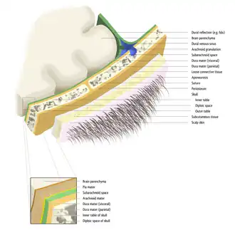 ![]() Illustration depicting the layers of the scalp and meninges | |