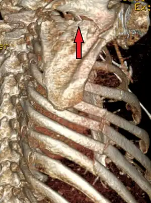 The injury is associated with other injuries 80–90% of the time.[1] Scapular fracture is associated with pulmonary contusion more than 50% of the time.[8] Thus when the scapula is fractured, other injuries such as abdominal and chest trauma are automatically suspected.[1] People with scapular fractures often also have injuries of the ribs, lung, and shoulder.[4] Pneumothorax (an accumulation of air in the space outside the lung), clavicle fractures, and injuries to the blood vessels are among the most commonly associated injuries.[4] The forces involved in scapular fracture can also cause tracheobronchial rupture, a tear in the airways.[9] Fractures that occur in the scapular body are the type most likely to be accompanied by other injuries; other bony and soft tissue injuries accompany these fractures 80–95% of the time.[3] Associated injuries can be serious and potentially deadly,[3] and usually it is the associated injuries, rather than the scapular fracture, that have the greatest effect on the outcome.[4] Scapular fractures can also occur by themselves; when they do, the death rate (mortality) is not significantly increased.[4]