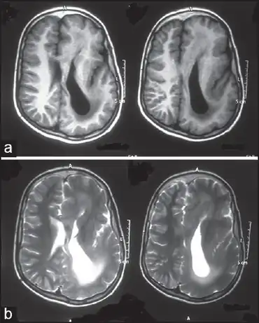 | Linear nevus sebaceous syndrome-(a)Left hemimegalencephaly with agyria-pachygyria complex b)left ventricle colpocephaly | |