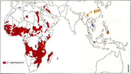 S. hematobium is found in Africa and the Middle East, where infants and young children are most infected.[9] Infection is most prevalent in both the Nile Delta and the Nile Valley South of Cairo. The first epidemiological survey in 1937 indicated that infection rate was as high as 85% among people in the Northern and Eastern parts of the Delta. Following construction of the Aswan Dam, basin irrigation is converted to perennial irrigation system, and this has significantly reduced the infection.[14]