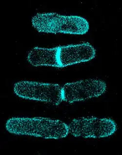 Fission yeast has become a notable model system to study basic principles of a cell that can be used to understand more complex organisms like mammals and in particular humans.[29][30] This single cell eukaryote is nonpathogenic and easily grown and manipulated in the lab.[31][32] Fission yeast contains one of the smallest numbers of genes of a known genome sequence for a eukaryote, and has only three chromosomes in its genome.[33] Many of the genes responsible for cell division and cellular organization in fission yeast cell are also found in the human's genome.[31][32][34] Cell cycle regulation and division are crucial for growth and development of any cell. Fission yeast's conserved genes has been heavily studied and the reason for many recent biomedical developments.[35][36] Fission yeast is also a practical model system to observe cell division because fission yeast's are cylindrically shaped single celled eukaryotes that divide and reproduce by medial fission.[31] This can easily be seen using microscopy. Fission yeast also have an extremely short generation time, 2 to 4 hours, which also makes it an easy model system to observe and grow in the laboratory.[32] Fission yeast's simplicity in genomic structure yet similarities with mammalian genome, ease of ability to manipulate, and ability to be used for drug analysis is why fission yeast is making many contributions to biomedicine and cellular biology research, and a model system for genetic analysis.[32][25][30][37][38]