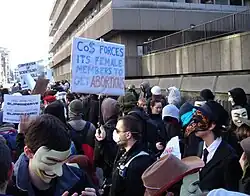 In March 2009, investigative journalist Nathan Baca of KESQ-TV interviewed former Scientologist Maureen Bolstad.[28] Bolstad said that women who worked at Scientology's headquarters were forced to have abortions, or faced being declared a "Suppressive Person" by the organization's management.[28][29] Bolstand told Baca, "If a woman gets pregnant, and does not abort the child, then they are declared a suppressive person. Because, it kind of started out gradually. At first, the thing was, the Church of Scientology International did not want to pay for child care."[29] L. Ron Hubbard stated those declared suppressive persons, "cannot be granted the rights ordinarily accorded rational beings".[29] As part of their protest movement against Scientology, in June 2009 the group Anonymous released a statement highlighting what it referred to as "abuses in the Sea Org", including "Child labor, coerced abortions, harsh working conditions, human trafficking, cruel punishment, disconnection of families", and asserted a "Cadet Org" for children within the Sea Org "was disbanded as unnecessary when abortions were made mandatory for Sea Org women."[30]