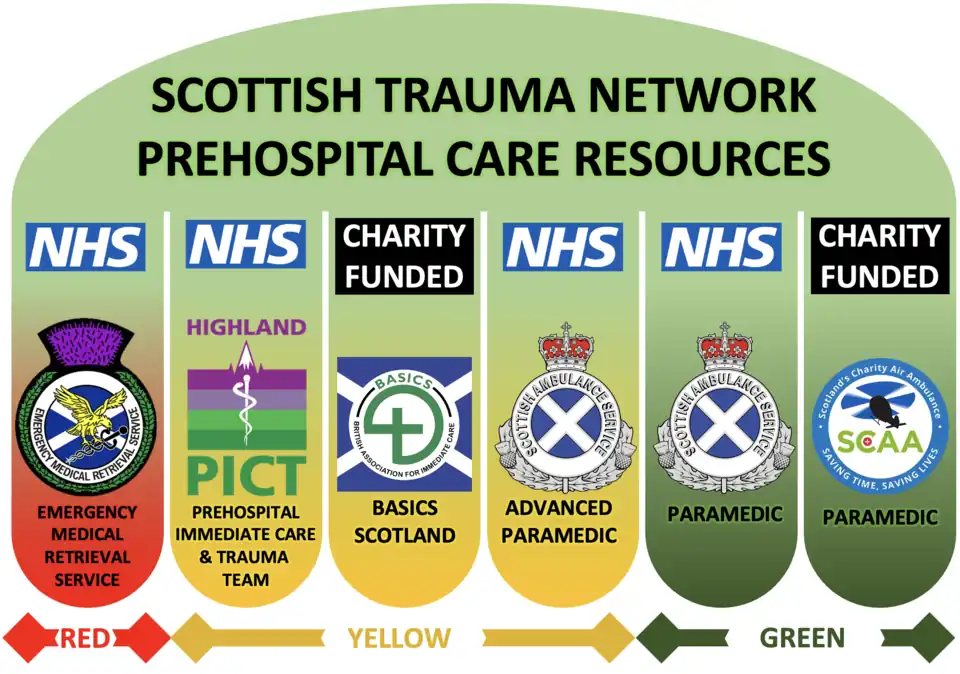 The Scottish Ambulance Service coordinates the pre-hospital and inter-hospital transfer elements of the Scottish Trauma Network. This response comes from the Scottish Ambulance Service and a number of partner agencies. These are sometimes categorised as Red, Yellow and Green resources;[23] of these, Medic One and BASICS Scotland are registered charities. The use of Yellow and Red categorisation is also applied to the enhanced skills offered by different teams or clinicians.