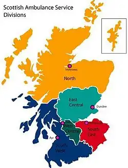 Former Renault Master van ambulance pictured in 2008Map of the five regional divisions within the Scottish Ambulance Service.