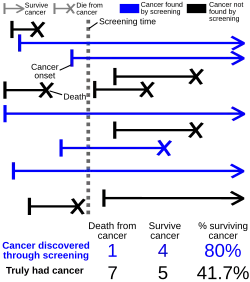 If screening works, it must introduce a lead time. So statistics of survival time since diagnosis tends to increase with screening because of the lead time introduced, even when screening offers no benefits. If we do not think about what survival time actually means in this context, we might attribute success to a screening test that does nothing but advance diagnosis. As survival statistics suffers from this and other biases, comparing the disease mortality (or even all-cause mortality) between screened and unscreened population gives more meaningful information.