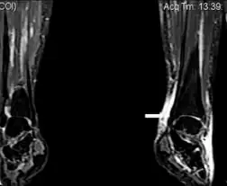 | Image with extensive epifascial edema in left foot of individual with secondary lymphedema | |