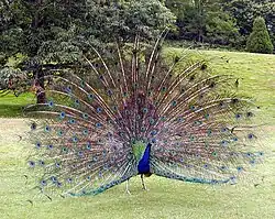 Examples of secondary sex characteristics in non-human animals include manes of male lions[4] and long feathers of male peafowl, the tusks of male narwhals, enlarged proboscises in male elephant seals and proboscis monkeys, the bright facial and rump coloration of male mandrills, horns in many goats and antelopes,[10] and the swollen upper lip and elongated premaxillary and maxillary teeth of male spikethumb frogs.[11] Male fish develop "nuptial tubercles",[12] mainly on their snouts, in the breeding season. These are an honest signal of health, and may assist females in sexual selection for species that use lek mating, such as the roach Rutilus rutilus.[13]