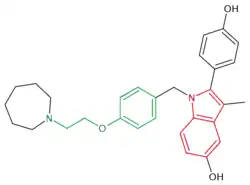 The SERMs are known to feature four distinctive modes of binding to ER. One of those features are strong hydrogen bonds between the ligand and ERα's Arg-394 and Glu-353 that line the "A-ring pocket" and help the ligand to stay in ER's binding pocket. This is unlike 17β-estradiol which is hydrogen bonded to His-524 in the "D-ring pocket".[15] Other distinctive bindings to the ligand-binding pocket are with a nearly planar "core" structure typically composed of a biaryl heterocycle, equivalent to the A-ring and B-ring of 17β-estradiol, to the corresponding binding site; a bulky side chain from the biaryl structure, analogous to the B-ring of 17β-estradiol and finally a second side group that is the C- and D-ring equivalent and usually aromatic, fills the remainder volume of the ligand-binding pocket.[32]
