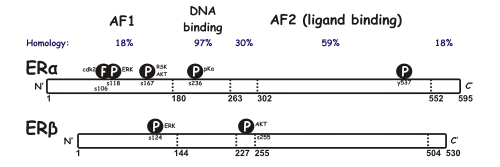 When looking at the differences between ERα and ERβ, Activating Function 1 (AF-1) and AF-2 are important. Together they play an important part in the interaction with other co-regulatory proteins that control gene transcription.[21][4] AF-1 is located in the amino terminus of the ER and is only 20% homologous in ERα and ERβ. On the other hand, AF-2 is very similar in ERα and ERβ, and only one amino acid is different.[4] Studies have shown that by switching AF-1 regions in ERα and ERβ, that there are specific differences in transcription activity. Generally, SERMs can partially activate engineered genes through ERα by an estrogen receptor element, but not through ERβ.[21][4][22] Although, raloxifene and the active form of tamoxifen can stimulate AF-1-regulated reporter genes in both ERα and ERβ.[4]