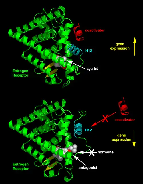 - ↑ Brzozowski AM, Pike AC, Dauter Z, Hubbard RE, Bonn T, Engström O, Öhman L, Greene GL, Gustafsson JÅ, Carlquist M (1997). "Molecular basis of agonism and antagonism in the oestrogen receptor". Nature. 389 (6652): 753–8. Bibcode:1997Natur.389..753B. doi:10.1038/39645. PMID 9338790. S2CID 4430999.