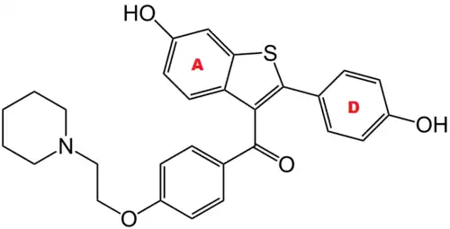 Raloxifene, like 4-hydroxytamoxifen, binds to ERα with the hydroxyl group of its phenolic "A ring" through hydrogen bonds with Arg-394 and Glu-353. In addition to these bonds, raloxifene forms a second hydrogen bond to ER through the side group of His-524 because of the presence of a second hydroxyl group in the "D ring". This hydrogen bond is also unlike that between 17β-estradiol and His-524, as the imidazole ring of His-524 is rotated to counteract the difference of the oxygen position in raloxifene and in 17β-estradiol. Just like in 4-hydroxytamoxifen, the bulky side chain of raloxifene displaces helix 12.[14]