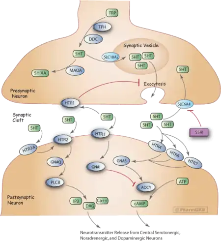 - ↑ Köhler S, Cierpinsky K, Kronenberg G, Adli M (January 2016). "The serotonergic system in the neurobiology of depression: Relevance for novel antidepressants". Journal of Psychopharmacology. 30 (1): 13–22. doi:10.1177/0269881115609072. PMID 26464458. S2CID 21501578.