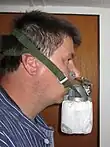 Once in use, the respirator has a working life of around two hours.[2] They are used by holding a mouthpiece in the mouth, with the weight of the respirator taken by a headband. A nose clip keeps the nose shut and all breathing, in and out, must be through the mouth and the respirator. In use, the hot air from the respirator is known to be unpleasant to breathe and careful training is needed to reinforce the need to keep breathing through it, not to breathe cold untreated air from around it – the hotter the respirator exhaust, the higher the carbon monoxide concentration and the more dangerous it would be to breathe otherwise. Exhaled air also passes through the respirator mouthpiece and an exhaust valve, but not the catalyst, as damp exhaled air would affect its efficiency. Respirators may provide a heat exchanger to carry away some of their heat in this exhaled air.[2]