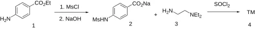 Sematilide can be synthesized from benzocaine (1).[1][2] Reaction with mesyl chloride, followed by saponification and removal of the water from the reaction mixture, gives sodium 4-[(methylsulfonyl)amino]benzoate (2). Chlorination with thionyl chloride gives 4-[(methylsulfonyl)amino]benzoyl chloride. Amide formation with N,N-diethylethylenediamine (3) then concludes the synthesis of sematilide (4).