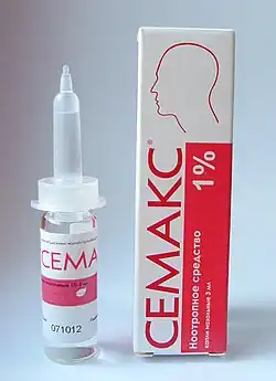 - 1 2 Eremin KO, Kudrin VS, Saransaari P, Oja SS, Grivennikov IA, Myasoedov NF, et al. (December 2005). "Semax, an ACTH(4-10) analogue with nootropic properties, activates dopaminergic and serotoninergic brain systems in rodents". Neurochemical Research. 30 (12): 1493–1500. doi:10.1007/s11064-005-8826-8. PMID 16362768. S2CID 38202287.