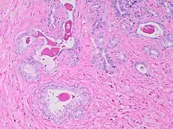 Histology of seminal vesicle glands on H&E stain. They may mimic prostatic adenocarcinoma by crowded glands with enlarged hyperchromatic and irregular nuclei, but will have inconspicuous nucleoli and coarse refractile golden brown lipofuscin granules.[7]