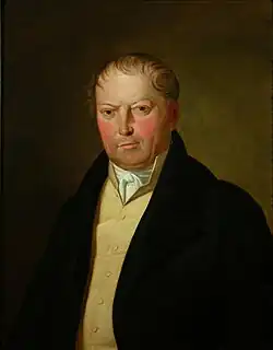 Two oval portrait medallions by August Canzi showing Ignaz Semmelweis and his wife, Mária Weidenhofer on their betrothal in 1857 were also bought from the doctor's grandson. The watercolour remains the only authentic painting from Semmelweis' adult life, created by a well-known contemporary artist working in Pest-Buda. Another portrait was painted about 1830 by Lénárt Landau, a painter in Pest. This oil-painting shows him as a child holding a Latin grammar-book in his hands. It was exhibited at the Semmelweis celebrations in 1894, and has been loaned permanently to the museum by its owner, the Budapest Historical Museum.[32] The oil portraits of his parents, Theresia Müller and Joseph Semmelweis, from an unknown contemporary painter, were also put on display in the memorial room.[33] The portraits of his maternal grandparents, Philipp Müller and Theresia Anderlin are hung above a bookcase; they were painted by Johann Volnhoffer in 1795.