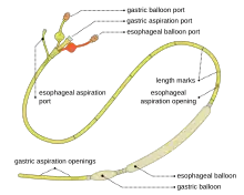 ![]() Diagram of a Sengstaken-Blakemore tube in use. There are sphygmomanometer drains connected with esophageal port, to enable inflating the balloon with correct pressure. | |