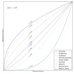 Magnitude estimation is a psychophysical method in which subjects assign perceived values of given stimuli. The relationship between stimulus intensity and perceptive intensity is described by Steven's power law.[8]