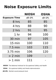 The safe amount of exposure is reduced by a factor of 2 for every exchange rate (3 dB for NIOSH standard or 5 dB for OSHA standard) increase in SPL. For example, the safe daily exposure amount at 85 dB (90 dB for OSHA) is 8 hours, while the safe exposure at 94 dB(A) (nightclub level) is only 1 hour. Noise trauma can also cause a reversible hearing loss, called a temporary threshold shift. This typically occurs in individuals who are exposed to gunfire or firecrackers, and hear ringing in their ears after the event (tinnitus).