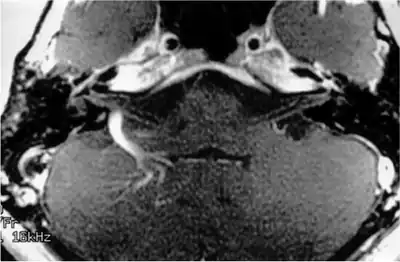 Individual with venous angioma of right cerebellum who presented with sensorineural hearing loss, image shows a prominent draining vein caused by venous angioma of right cerebellar hemisphere, which impinges on the vestibulocochlear nerve.