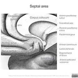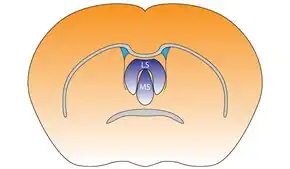 The septal area (medial olfactory area) has no relation to the sense of smell, but it is considered a pleasure zone in animals. The septal nuclei play a role in reward and reinforcement along with the nucleus accumbens. In the 1950s, Olds & Milner showed that rats with electrodes implanted in this area will self-stimulate repeatedly (e.g., press a bar to receive electric current that stimulate the neurons).[2] Experiments on the septal area of humans have taken place since the 1960s.[3][4][5][6]