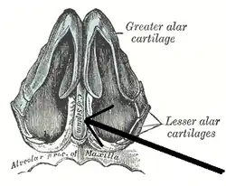 The septal nasal cartilage (cartilage of the septum or quadrangular cartilage) is composed of hyaline cartilage.[1] It is somewhat quadrilateral in form, thicker at its margins than at its center, and completes the separation between the nasal cavities in front.