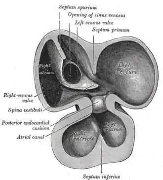 ![]() The developing human heart, at day 30. The septum primum (top middle) grows down to separate the primitive atrium into the left and right atrium of the human heart. | |