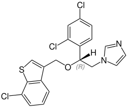 Sertaconazole contains a stereocenter and consists of two enantiomers. The pharmaceutical drug is a racemate, an equal mixture of the (R)- and (S)-forms.[5]