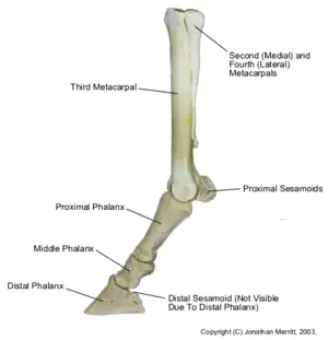 In the horse it occurs at the horse's fetlock. The sesamoid bones lie behind the bones of the fetlock, at the back of the joint, and help to keep the tendons and ligaments that run between them correctly functioning.