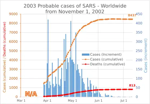 - ↑ "Summary of probable SARS cases with onset of illness from 1 November 2002 to 31 July 2003". World Health Organization (WHO). 31 December 2003. Archived from the original on 24 June 2011. Retrieved 31 October 2008.