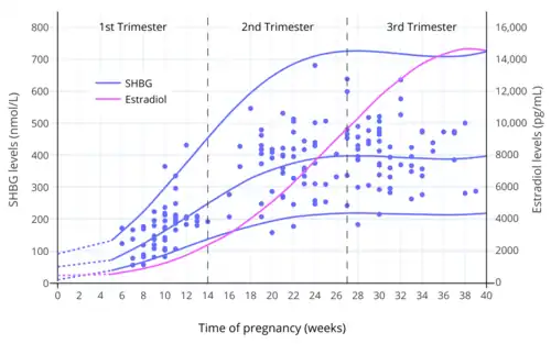 In utero, the human fetus has a low level of SHBG, allowing increased activity of sex hormones. After birth, the SHBG level rises and remains at a high level throughout childhood. At puberty the SHBG level halves in girls and goes down to a quarter in boys.[7] The change at puberty is triggered by growth hormone, and its pulsatility differs in boys and girls. In the third trimester of pregnancy, the SHBG level of the parent escalates to five to ten times the usual level for a woman.[7][9] A hypothesis is that this protects against the effect of hormone produced by the fetus.[7]