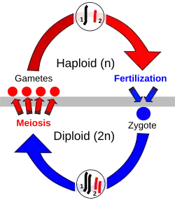 Sexual reproduction is a type of reproduction that involves a complex life cycle in which a gamete (haploid reproductive cells, such as a sperm or egg cell) with a single set of chromosomes combines with another gamete to produce a zygote that develops into an organism composed of cells with two sets of chromosomes (diploid).[1] This is typical in animals, though the number of chromosome sets and how that number changes in sexual reproduction varies, especially among plants, fungi, and other eukaryotes.[2][3]