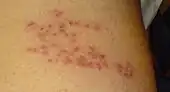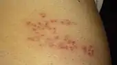 Shingles can be confused with herpes simplex, dermatitis herpetiformis and impetigo, and skin reactions caused by contact dermatitis, candidiasis, certain drugs and insect bites.[49]