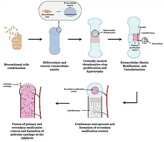Both short and long bones undergo endochondral ossification during development. In this process, bone is formed from an initial cartilaginous model and this model is then gradually replaced by bone. Despite sharing a common cellular origin, short and long bones have different structural features.[7]
