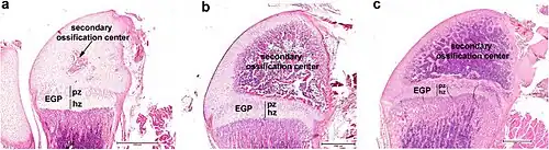 - ↑ Reno, Philip L.; Mcburney, Denise L.; Lovejoy, C. Owen; Horton, Walter E. (January 2006). "Ossification of the mouse metatarsal: Differentiation and proliferation in the presence/absence of a defined growth plate". The Anatomical Record Part A: Discoveries in Molecular, Cellular, and Evolutionary Biology. 288A (1): 104–118. doi:10.1002/ar.a.20268. ISSN 1552-4884. PMID 16342215.