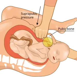 | Suprapubic pressure being used in a shoulder dystocia | |