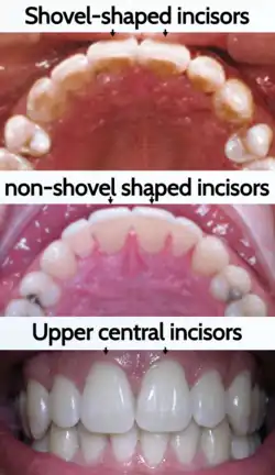- ↑ Portin P, Alvesalo L (July 1974). "The inheritance of shovel shape in maxillary central incisors". American Journal of Physical Anthropology. 41 (1): 59–62. doi:10.1002/ajpa.1330410108. PMID 4843087.