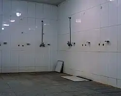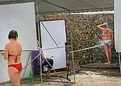 Many modern athletic and aquatic facilities provide showers for use by patrons, commonly in gender segregated changing rooms. These can be in the form of individual stalls shielded by curtains or a door, or communal shower rooms. The latter are generally large open rooms with any number of shower heads installed either directly into the walls or on posts throughout the shower area. Open showers are often provided at public swimming pools that require a pre-rinse[17] and at popular beaches. Military forces around the world set up field showers to enable the washing away of dangerous residue from modern weapons such as caustic chemicals, deadly biological agents, and radioactive materials, which can harm forces on both sides of a conflict.[18]